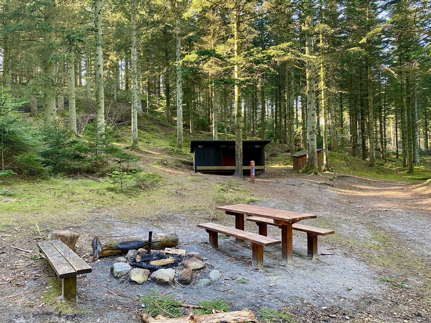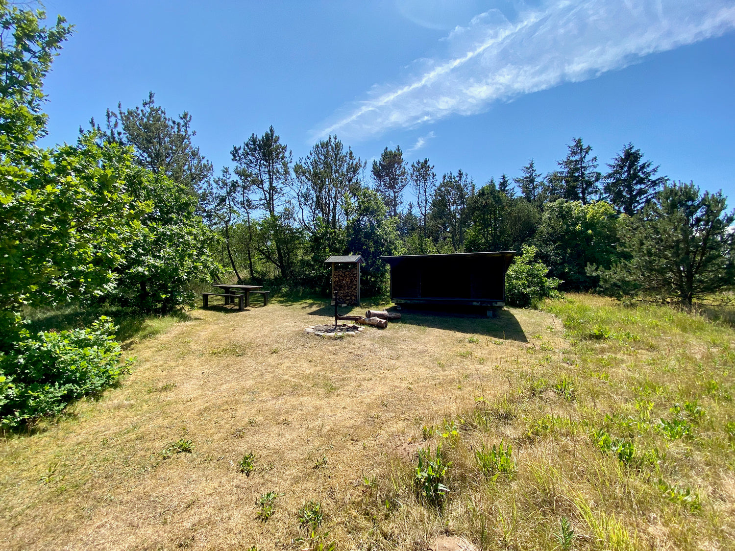 In addition to the shelter, there is a bonfire hut, fire pit, table and bench set, drinking water and space for play. There is also a compost toilet right next to the site.