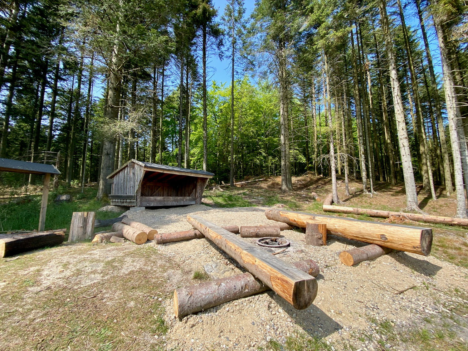 There is also a fire hut, fire pit with grill grate, several table and bench sets, water and forest playground, as well as a toilet in the car park approx. 100m from there.