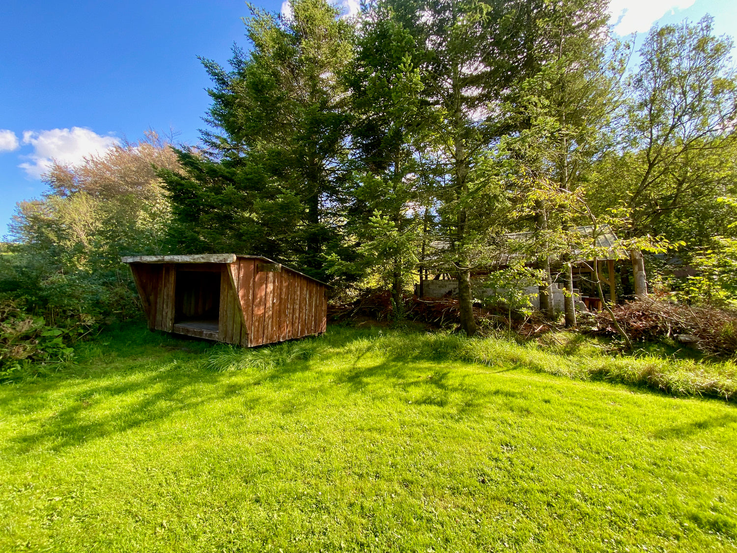 The shelter is protected by trees on the edge of an open meadow with a sandy beach, approx. 50m from the water's edge.