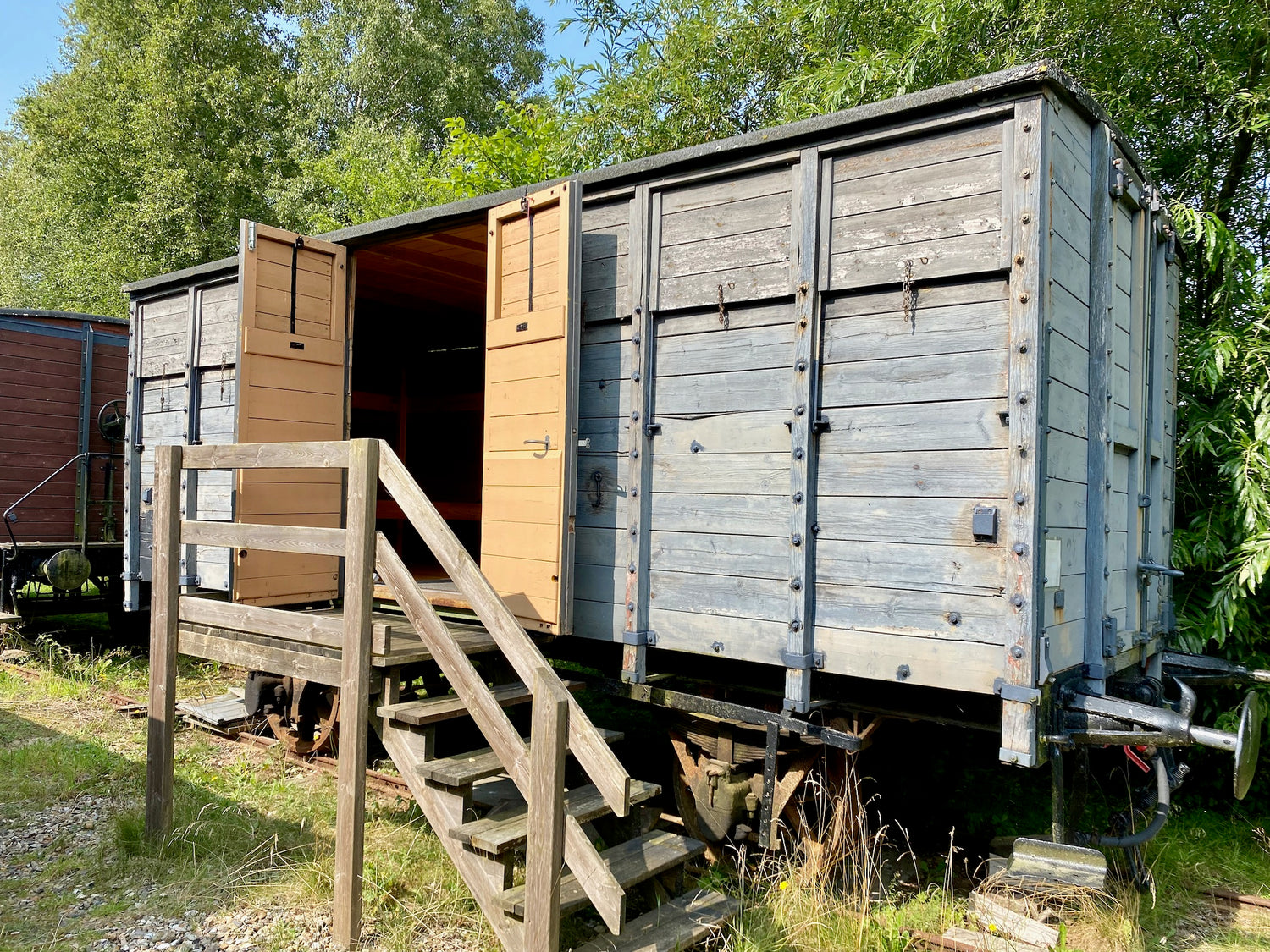 The gray freight car, built in 1908, has been fully restored and fitted with 12 sleeping places. Additionally, there are 4-5 spots on the floor in the old waiting room inside the warehouse.