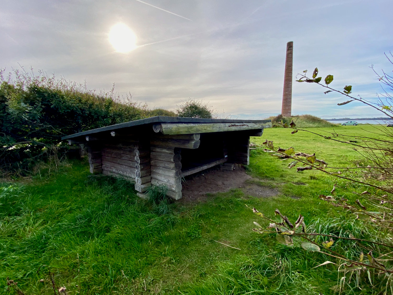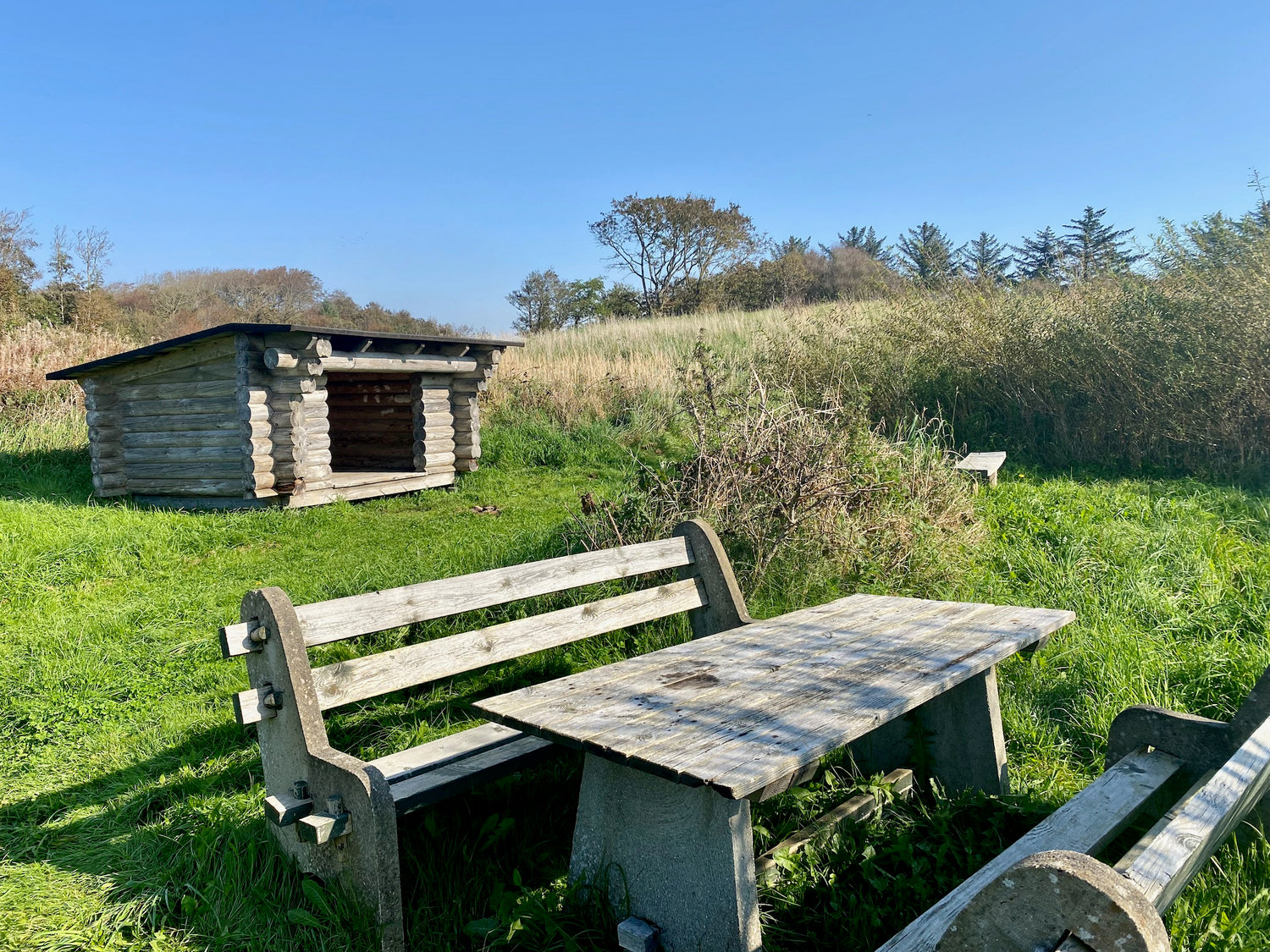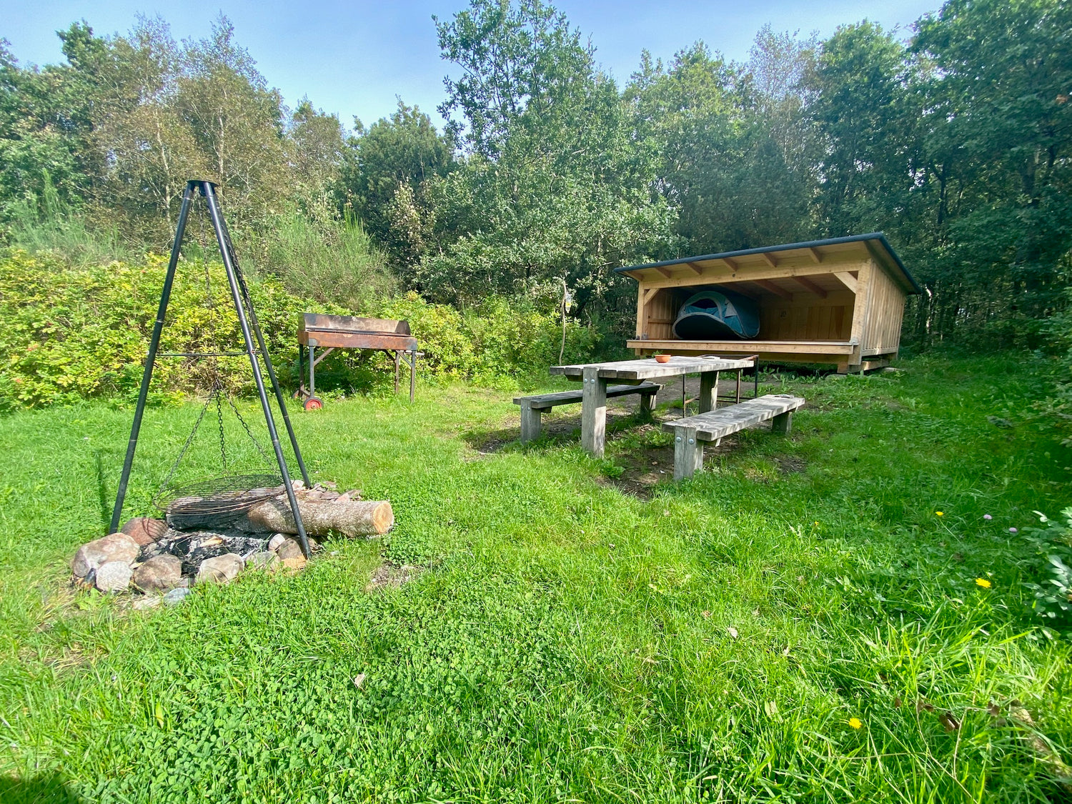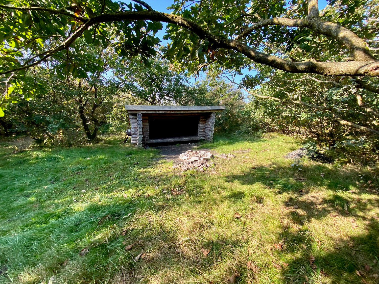 The shelter is well sheltered from the wind, hidden in the trees between Harre Vig Beach and Hjerk Stadium.