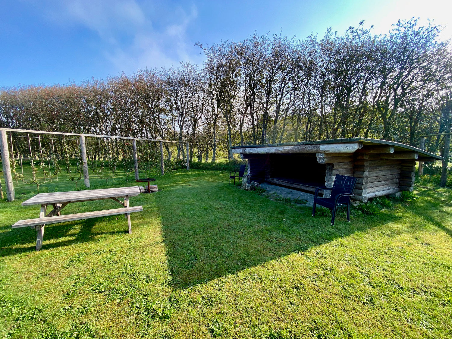 The shelter is located in a fenced area up the West Salling trail and close to Spøttrup castle. Around the shelter, an area with trellises, as well as apple and pear trees, has been established.