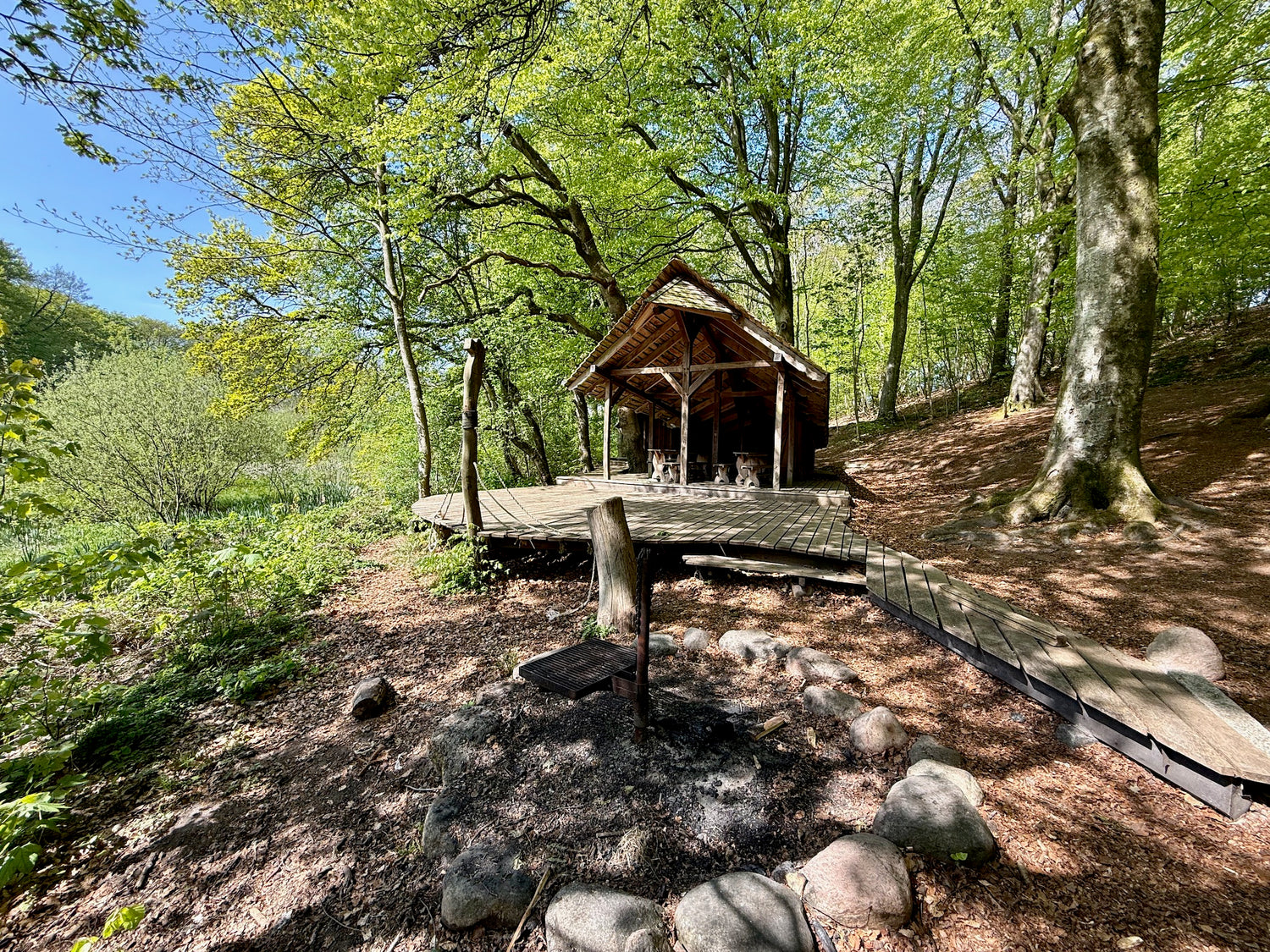 Snekken shelter is located in Ørslev Kloster's protected forest area, a few kilometers from the Limfjord, surrounded by old oak trees and overlooking a small forest lake.