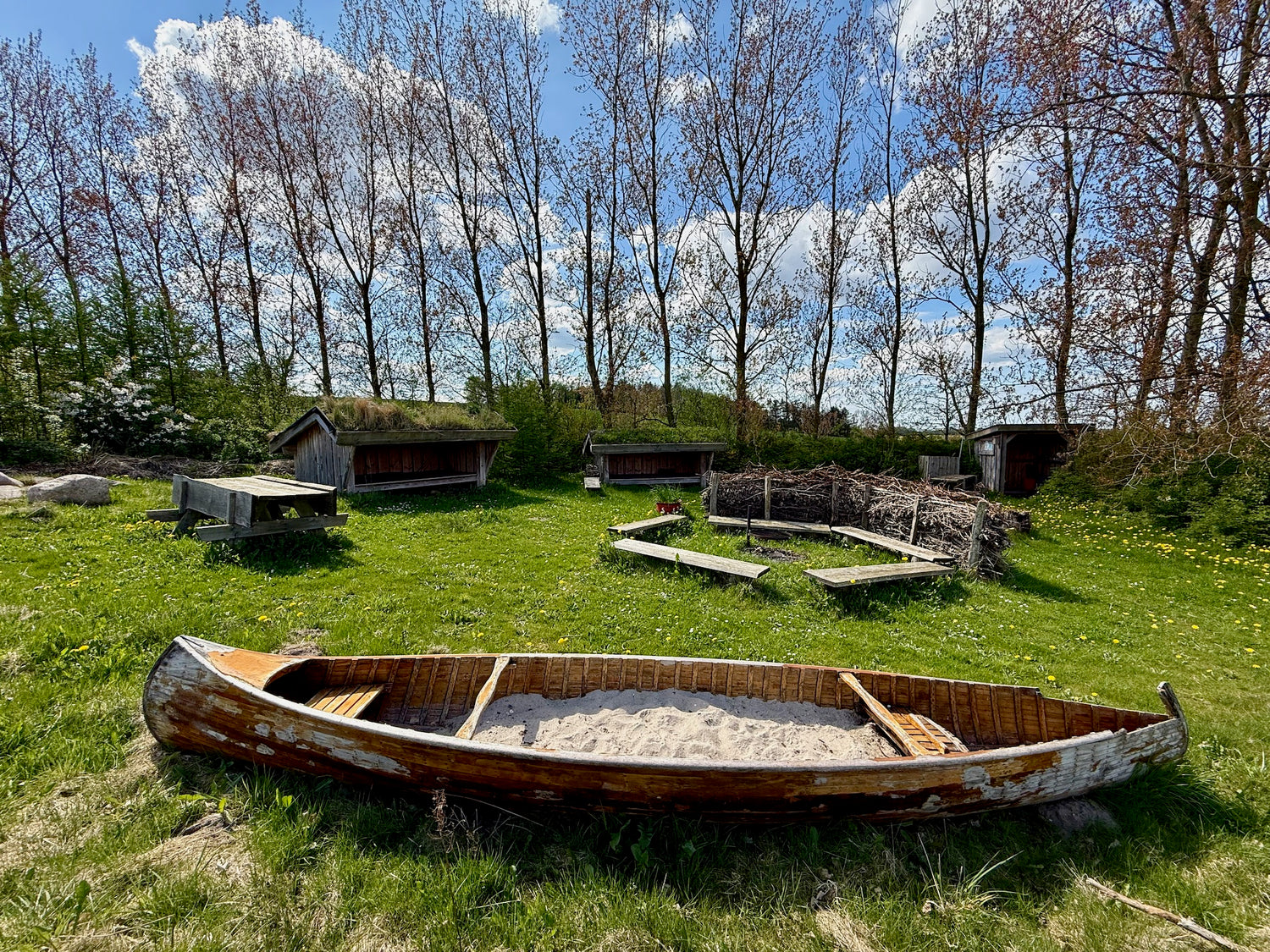 There is one shelter shaped like a Viking ship with space for 3-4 people.