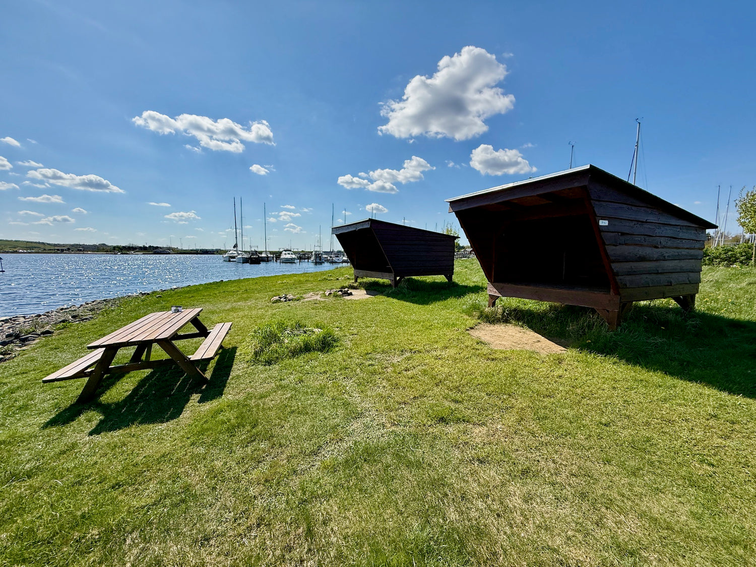 The shelters are located near the water at Virksund Marina and are located with a view towards Lovns Bredning, Ulbjerg cliff and the two Gravhøje south of the dam also called "Marens Patter".