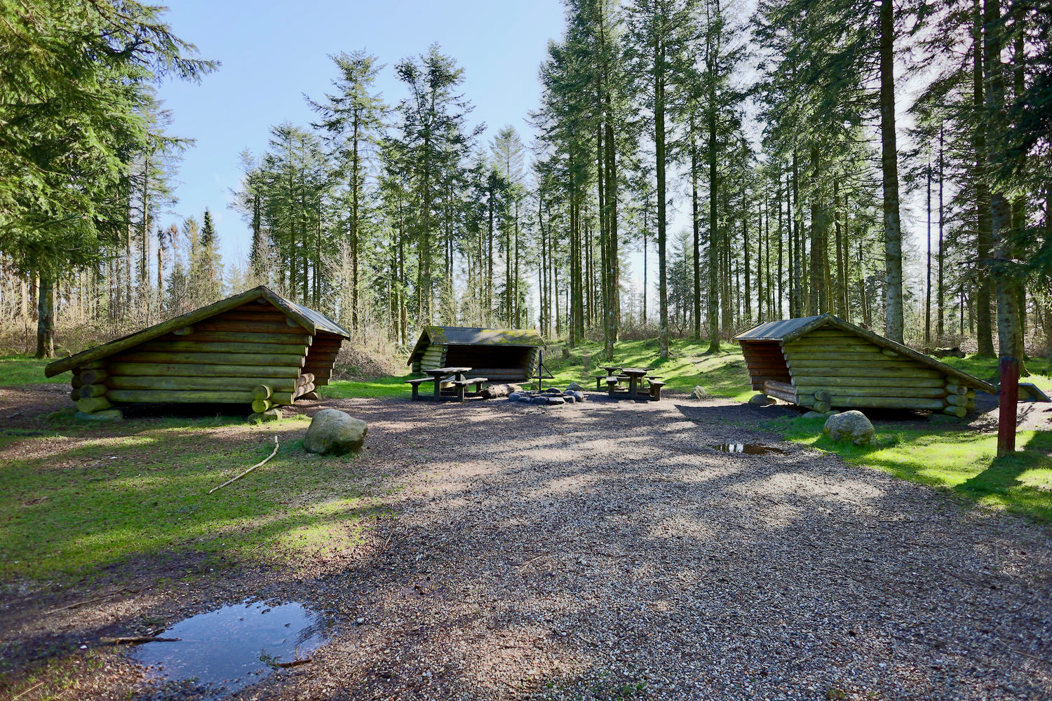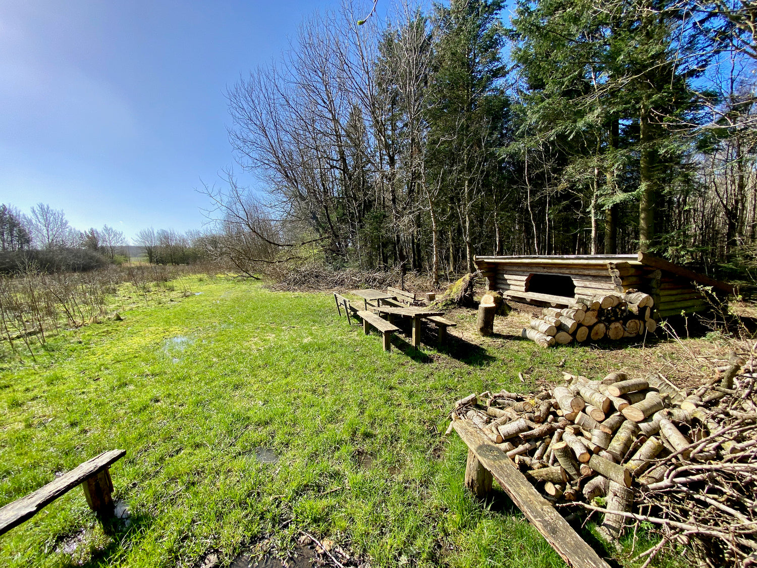 The shelter site is sheltered by a grass field on the edge of Plethøj Plantage.