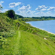 The long hiking trail at Kilen northwest of Struer is challenging with steep and uneven paths that lead through narrow footpaths where horses, goats and sheep graze, and offers a hilly landscape with terraces and small landslides.