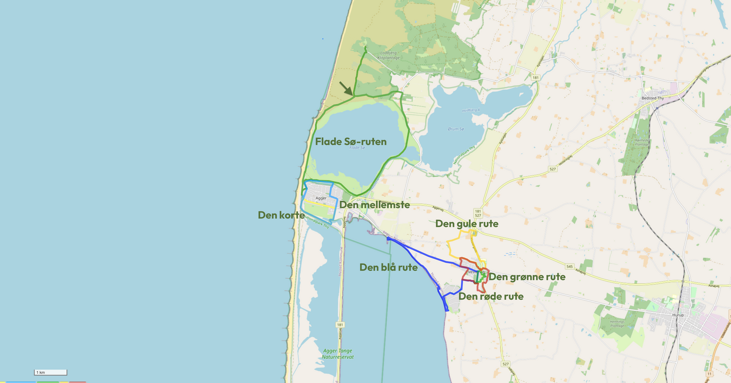 Nedenfor ser du stier ved Agger, Krik og Vestervig med kilometerangivelse.