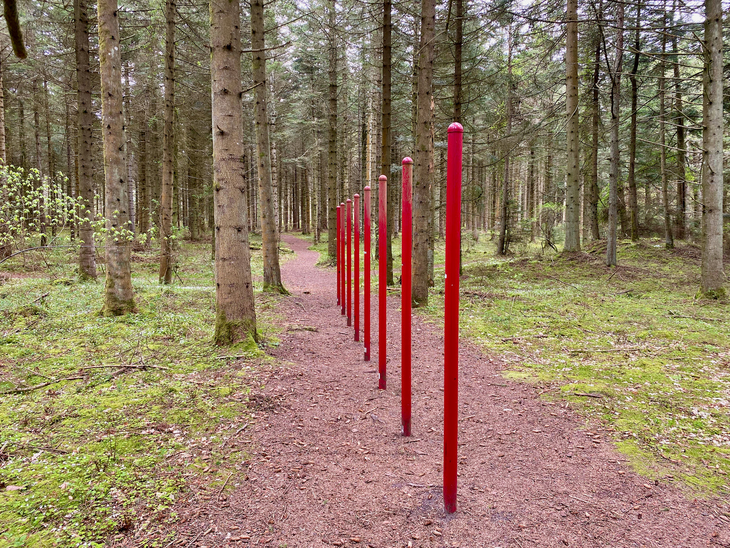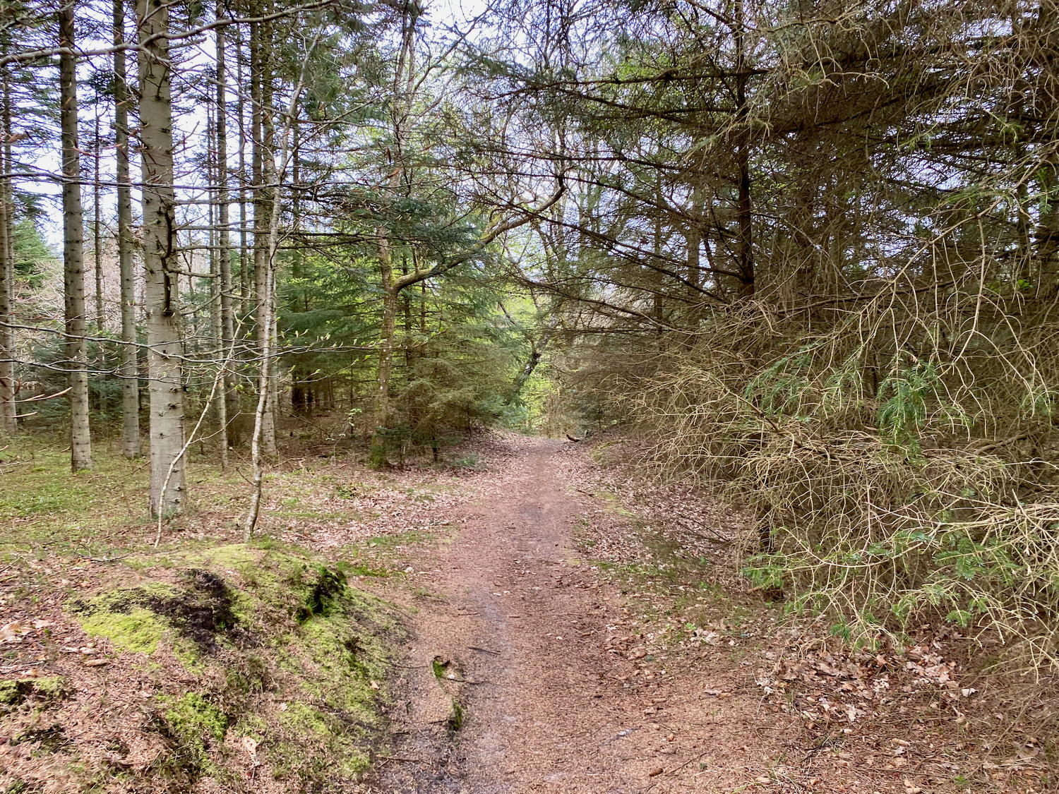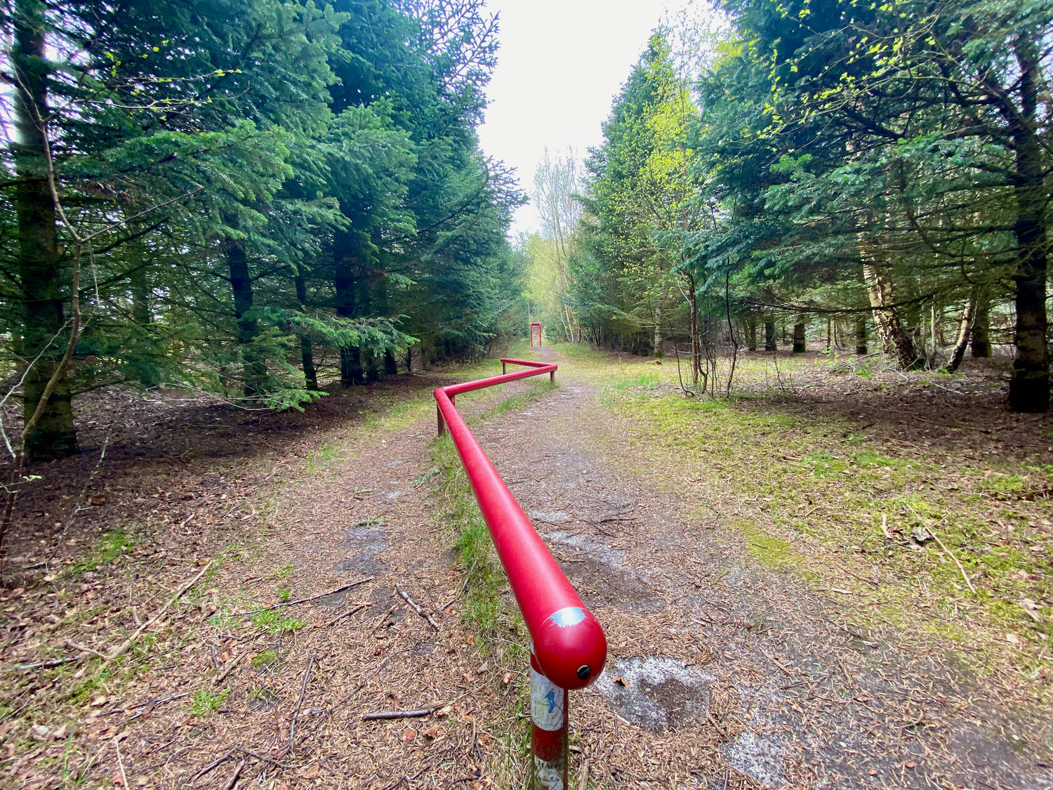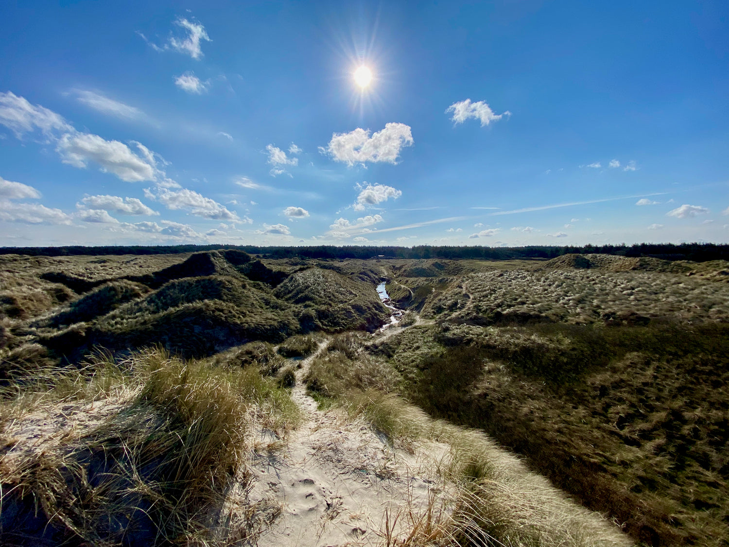 Den gule vandrerute, som ligger ved hundeskoven i Kirkesande, snor sig gennem det varierede terræn i Blokhus Klitplantage.