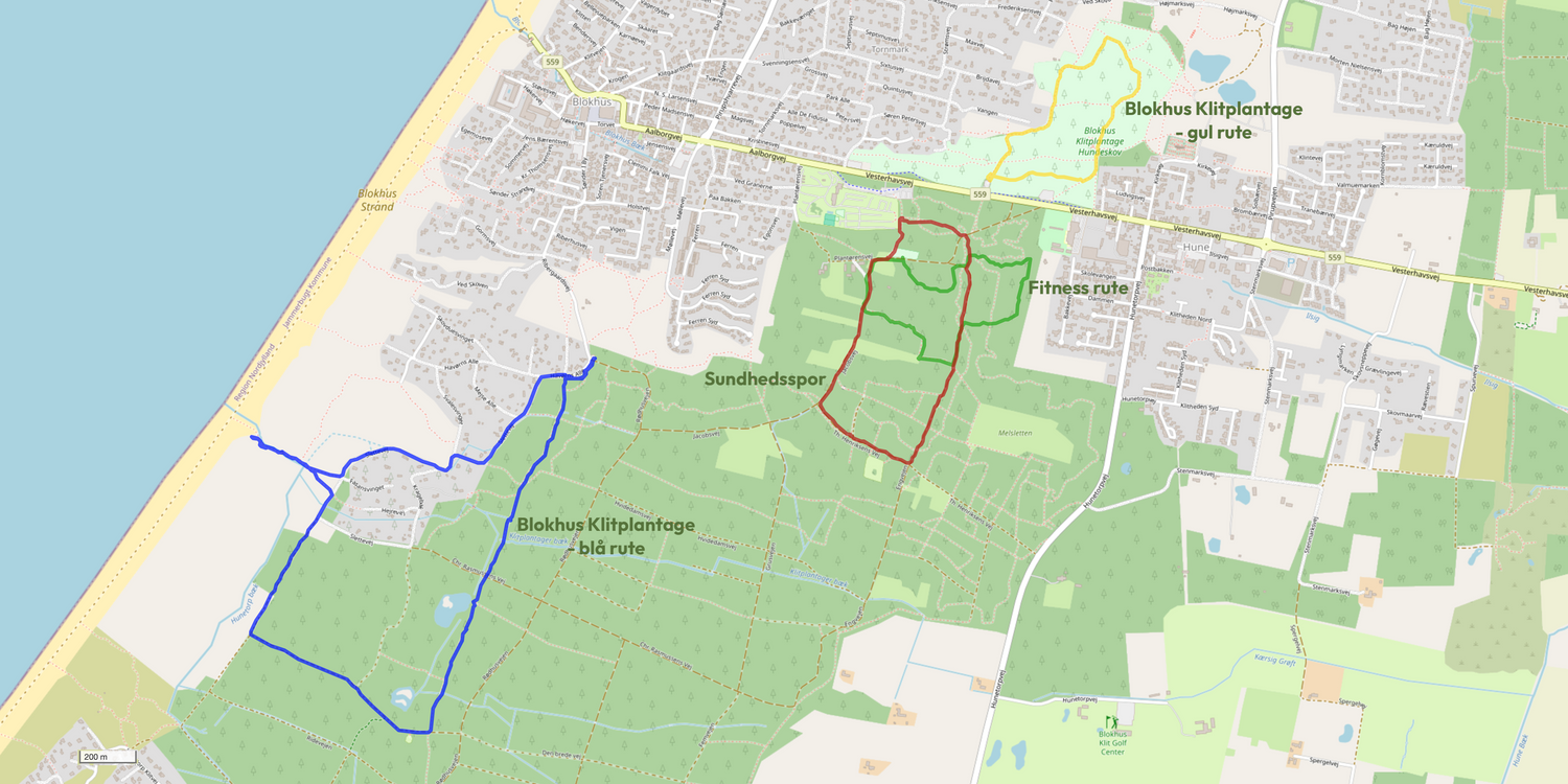 Nedenfor ser du stier ved Blokhus med kilometerangivelse.