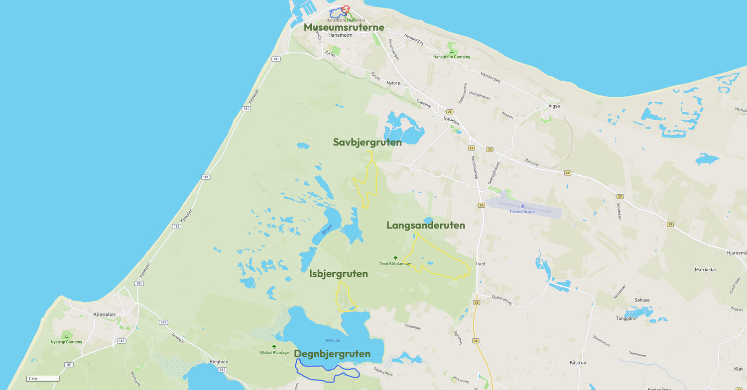 Nedenfor ser du de udvalgte vandrestier fra vandreområdet med kilometerangivelse.