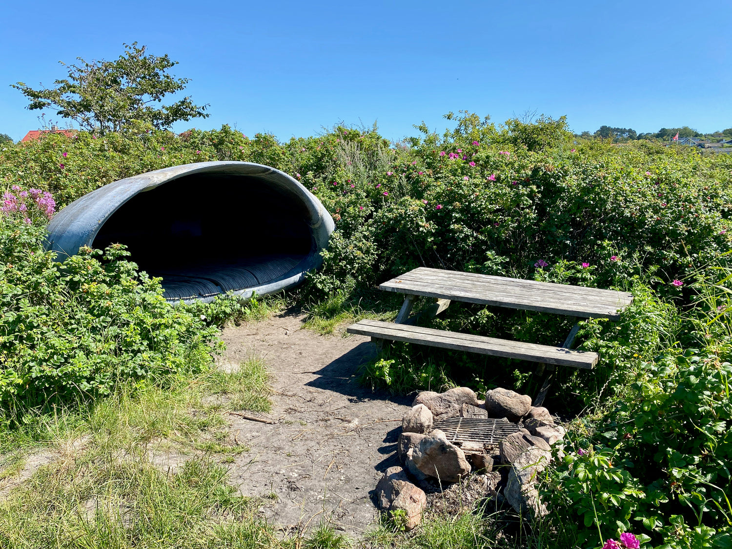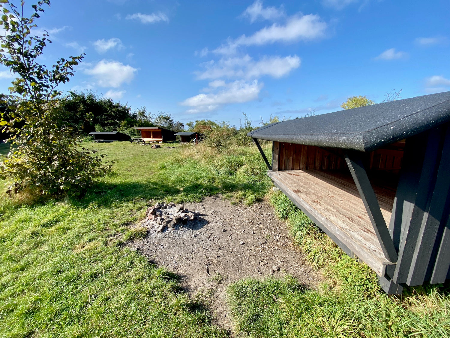 Ved shelterne er der en lille bålplads med en grillrist samt bord og siddepladser.