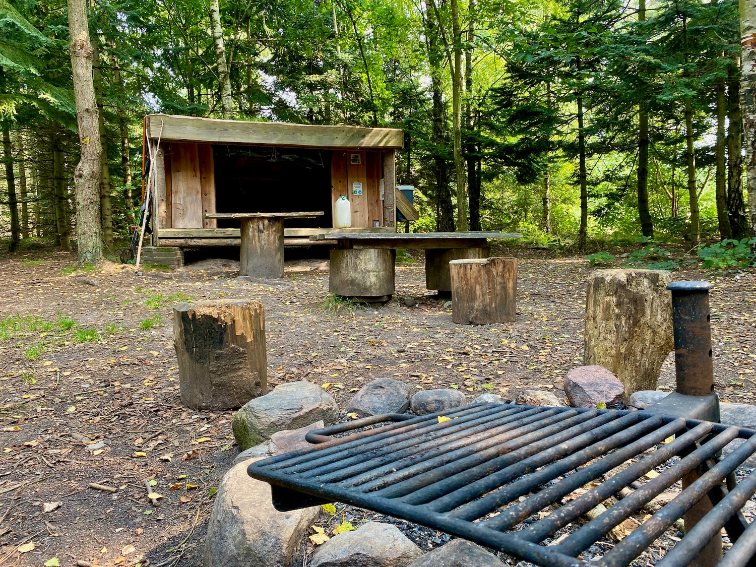 Ved shelteret er der en lille bålplads med en grillrist samt bord og siddepladser.