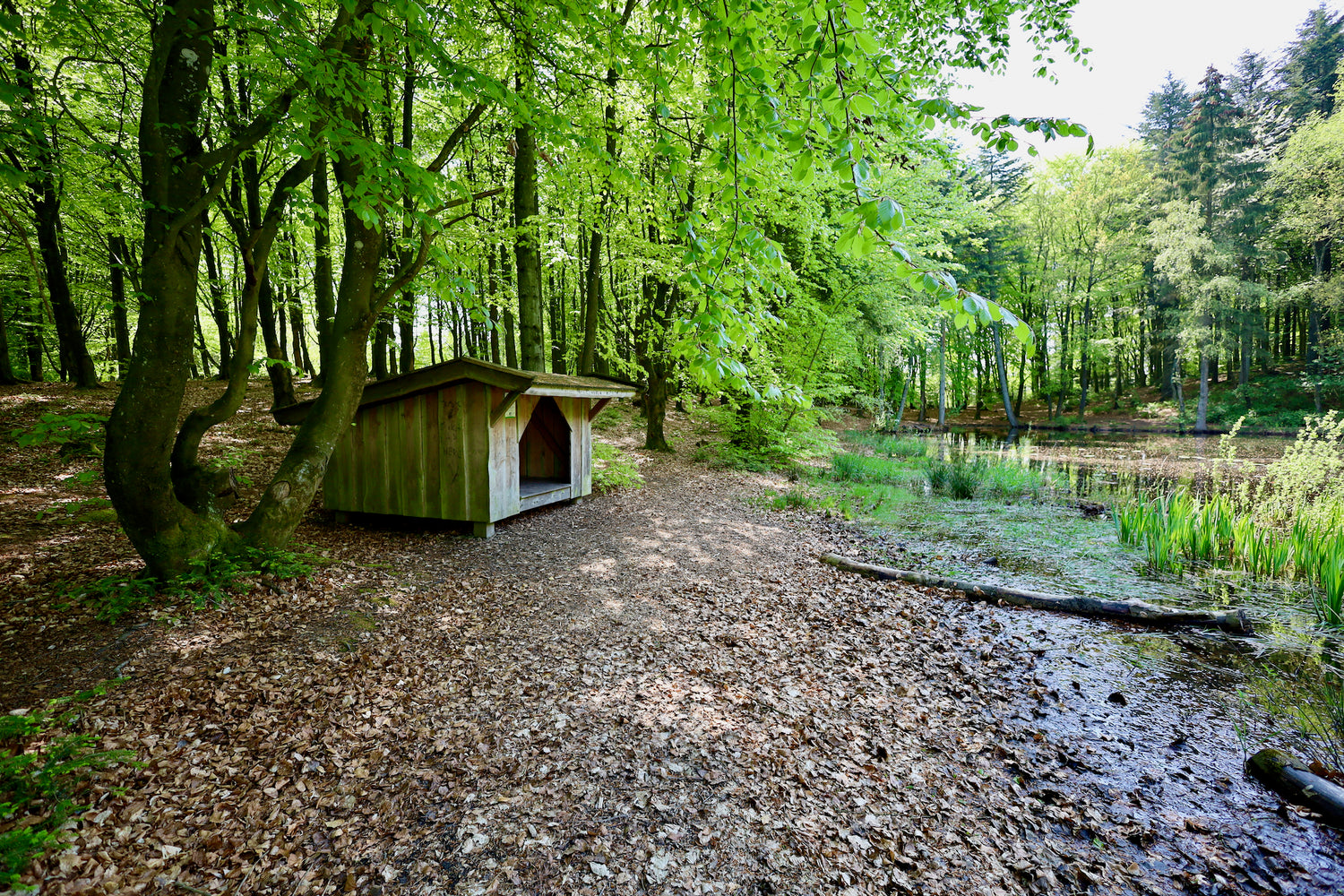 Shelteret ligger mellem træerne ved en rigtig hyggelig plads lige ved Hvidbjerg Å.
