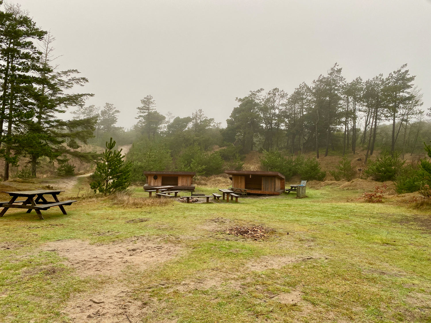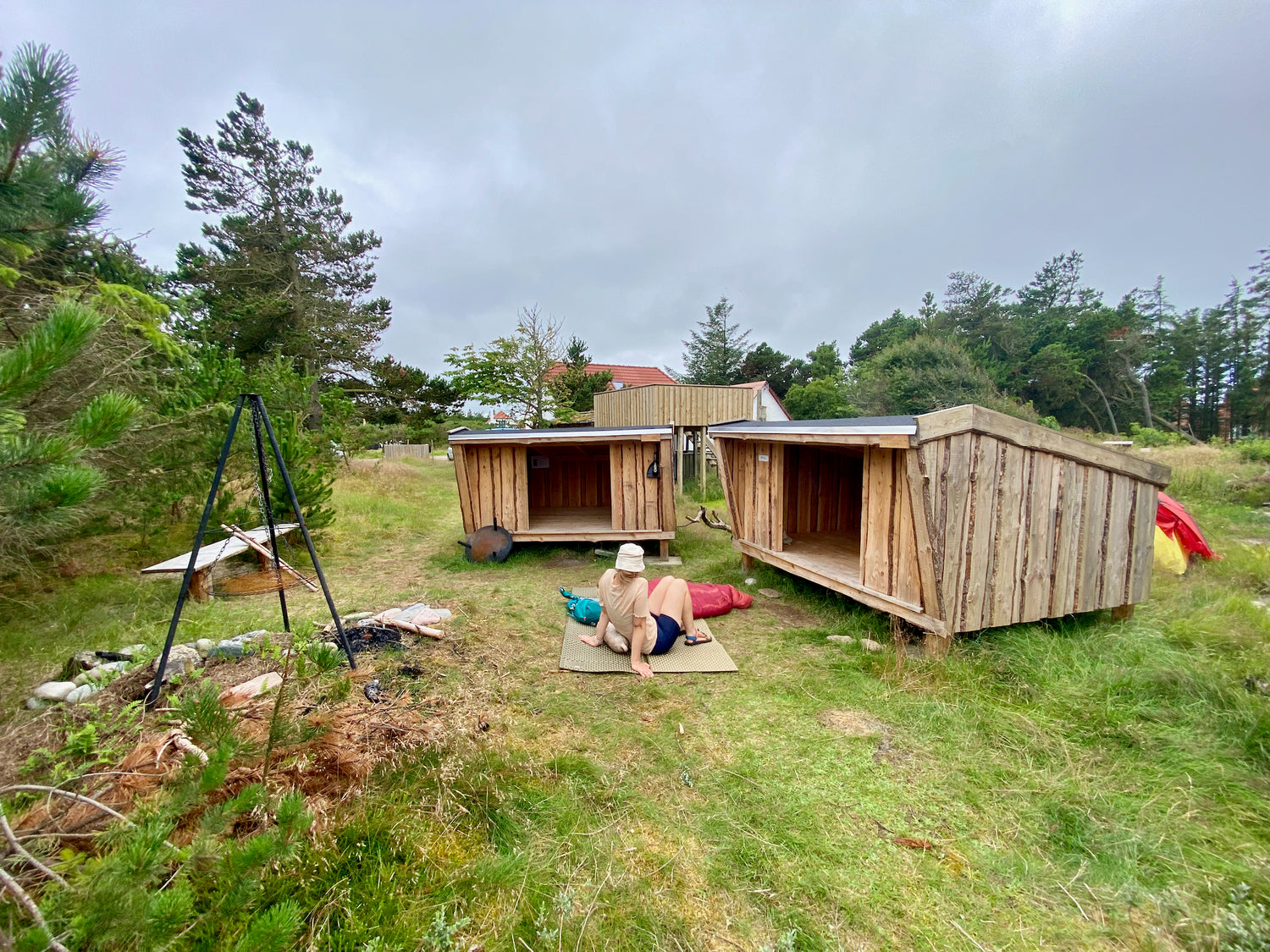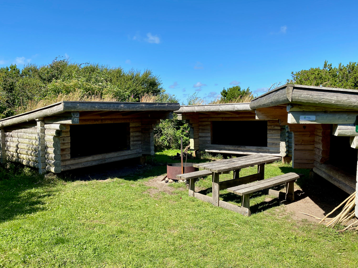 Shelterpladsen ligger mellem klitterne i baghaven til et privat sommerhus godt i læ for vinden.