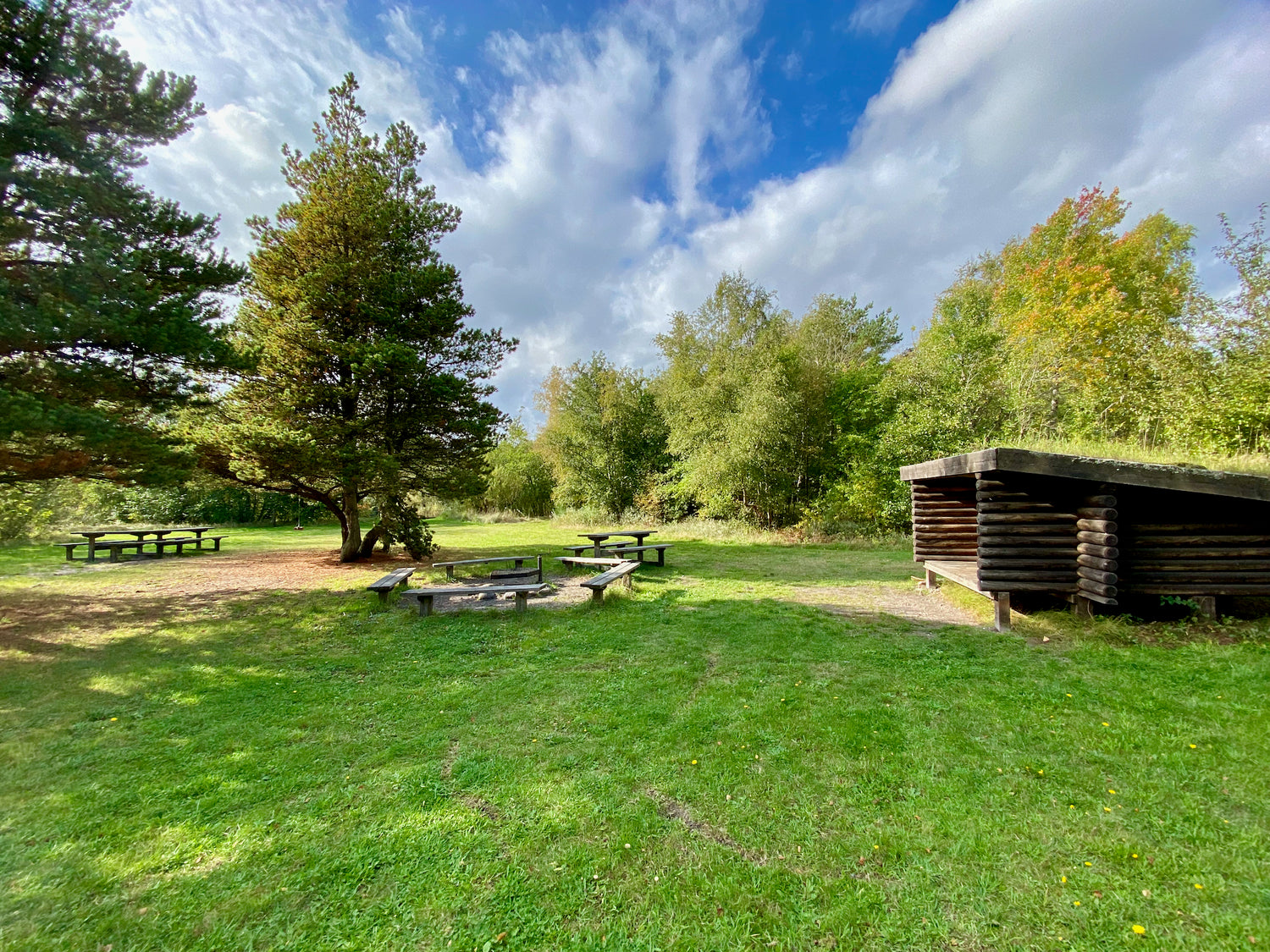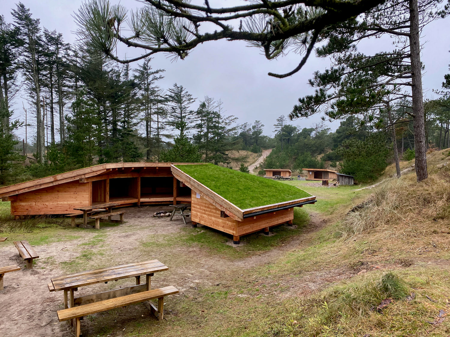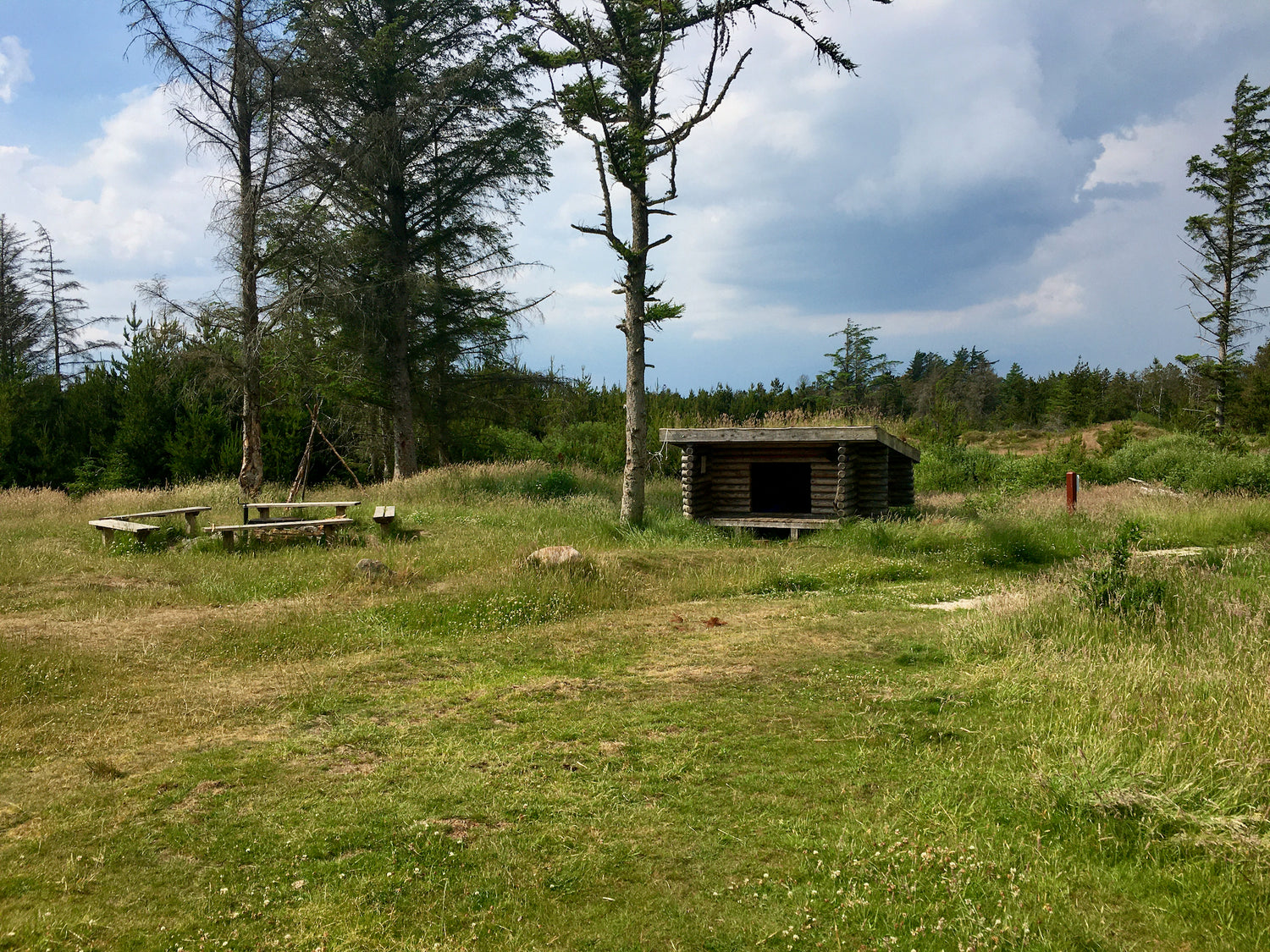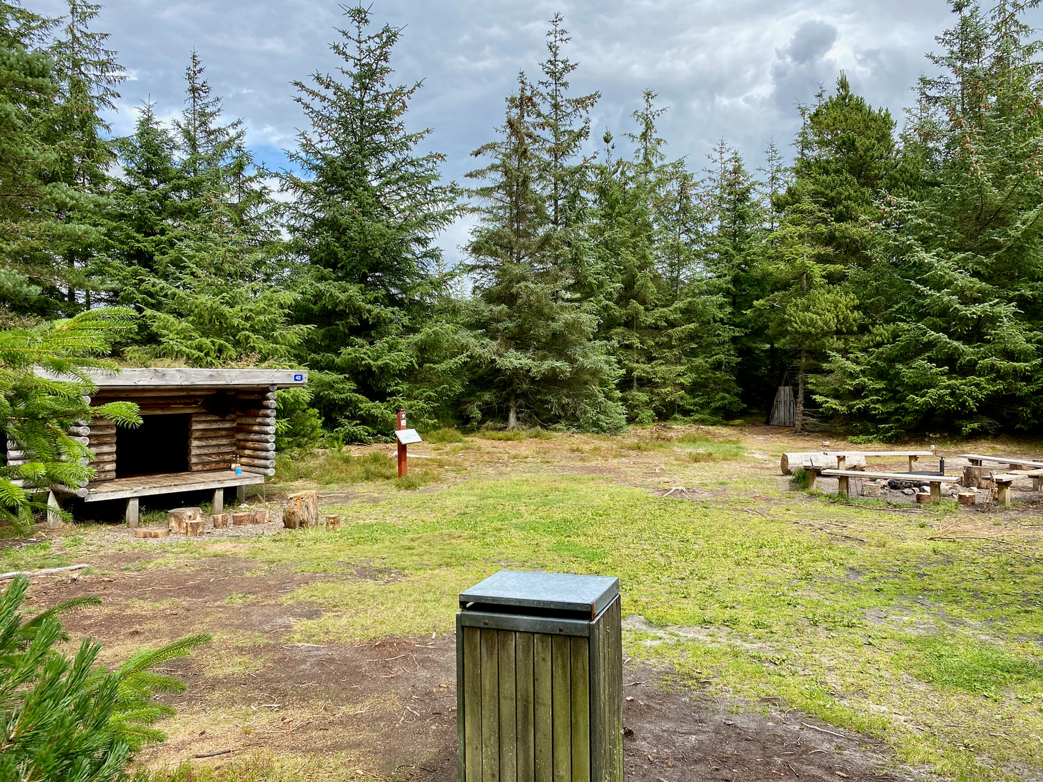 Det store shelter på lejrpladsen ved Lodbjerg Fyr ligger på en åben plads omkranset af fyrretræer kun 200 m nordvest for fyret.