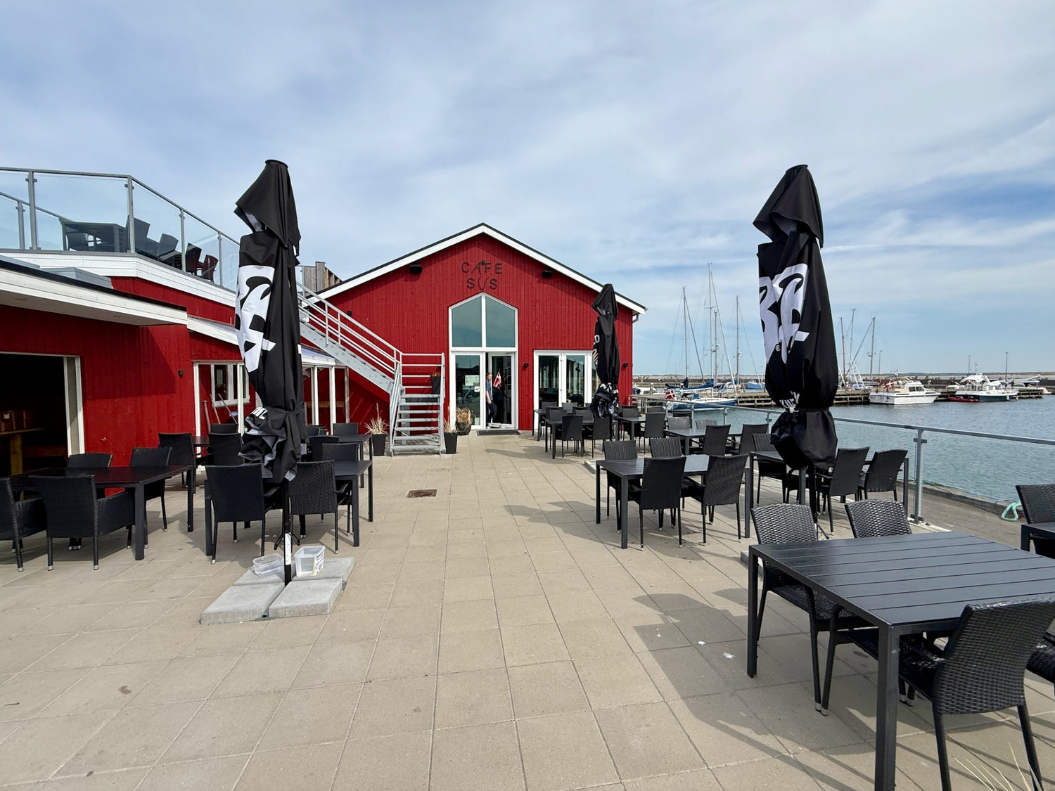 Café Sus ligger centralt ved havnen i Thyborøn, i en nybygget, marin rød bygning med panoramavinduer og solrig terrasse – perfekt til både hygge og afslapning ved vandet.
